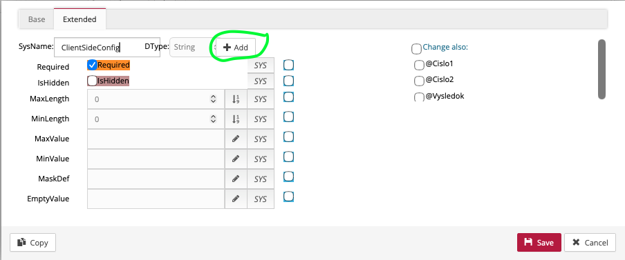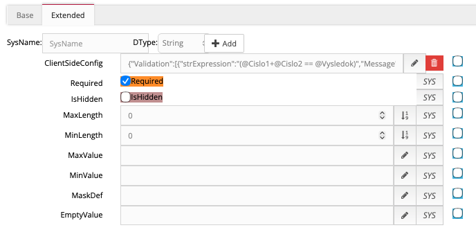 V záložke Extended vyplním do poľa SysName kľúč “ClientSideConfig”, vyberiem DType “String”, kliknem Pridať.