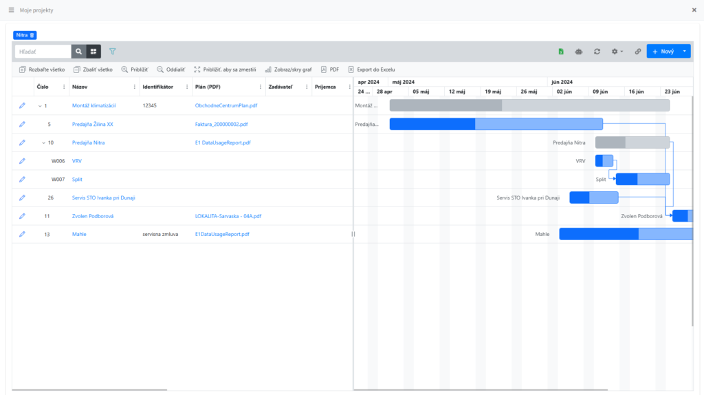 Ganttov diagram je nástroj na vizuálne plánovanie a sledovanie úloh v čase. Každá úloha je zobrazená ako vodorovný pruh na časovej osi, pričom začiatok pruhu predstavuje dátum začiatku úlohy a jeho dĺžka zodpovedá jej trvaniu. Diagram umožňuje prehľadne zobraziť poradie úloh, ich prípadné prepojenia (závislosti) a celkový priebeh projektu. V ERPIO App slúži Gantt zobrazenie na lepšiu orientáciu v plánovaných aktivitách, kontrolu termínov a identifikáciu potenciálnych kolízií alebo meškaní.