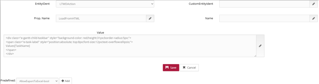 Pomocou nastavenie MetaData s vlastnosťou (PropName) GanttConfig, môžete meniť správanie sa zobrazenia. Toto nastavenie je možné urobiť v MetaData navigačnej akcie, ktorá smeruje na toto zobrazenie.