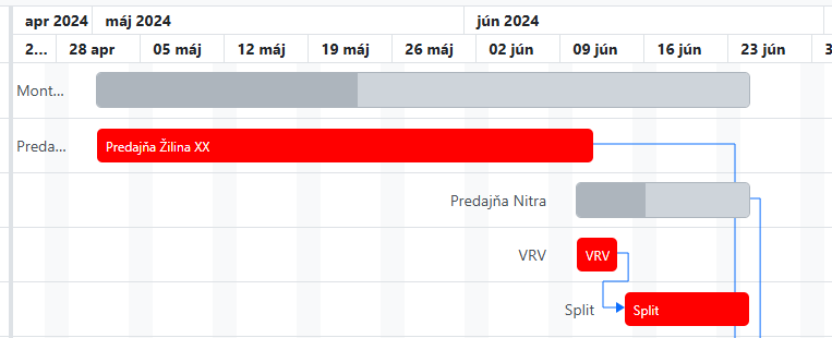 | Dependency | Identifikátor úlohy, od ktorej je aktuálna úloha závislá. Odkaz na predchádzajúcu úlohu pre zobrazenie šípok v grafe | Zobrazuje šípky medzi úlohami v Gantt diagrame, ktoré znázorňujú závislosti (napr. úloha B sa začne až po dokončení úlohy A) | Môže byť NULL, ak úloha nemá žiadne závislosti |