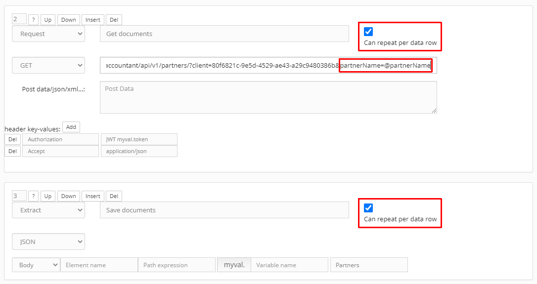 Dat. pumpu lze spustit i pro skupinu kroků (dvojici/e Request-Response), které se vykonají současně pro 1 řádek zdroj. tabulky (kroky musí mít zatrženou volbu „Can repeat per data row“).