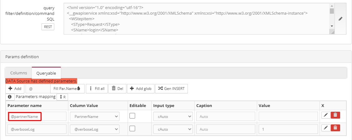 Pro každý řádek získané tabulky provede podle mapování sloupců, uvedených v Definici parametrů zdroje, náhradu parametrů (ParName za row[ValName]) v těchto vlastnostech kroků:
