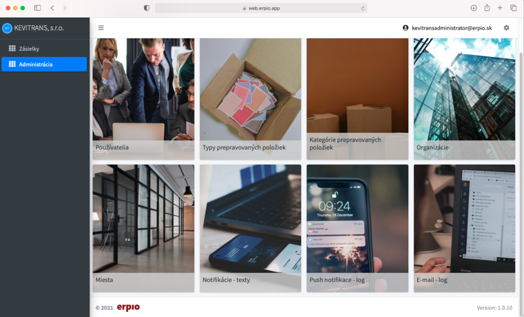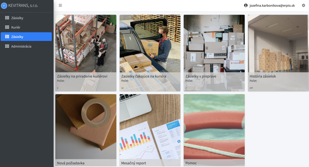 - Zásielky – slúži na prácu zo zásielkami, ich priraďovanie kuriérom, prehľad zásielok, ktoré sú aktuálne v preprave a prezeranie histórie zásielok