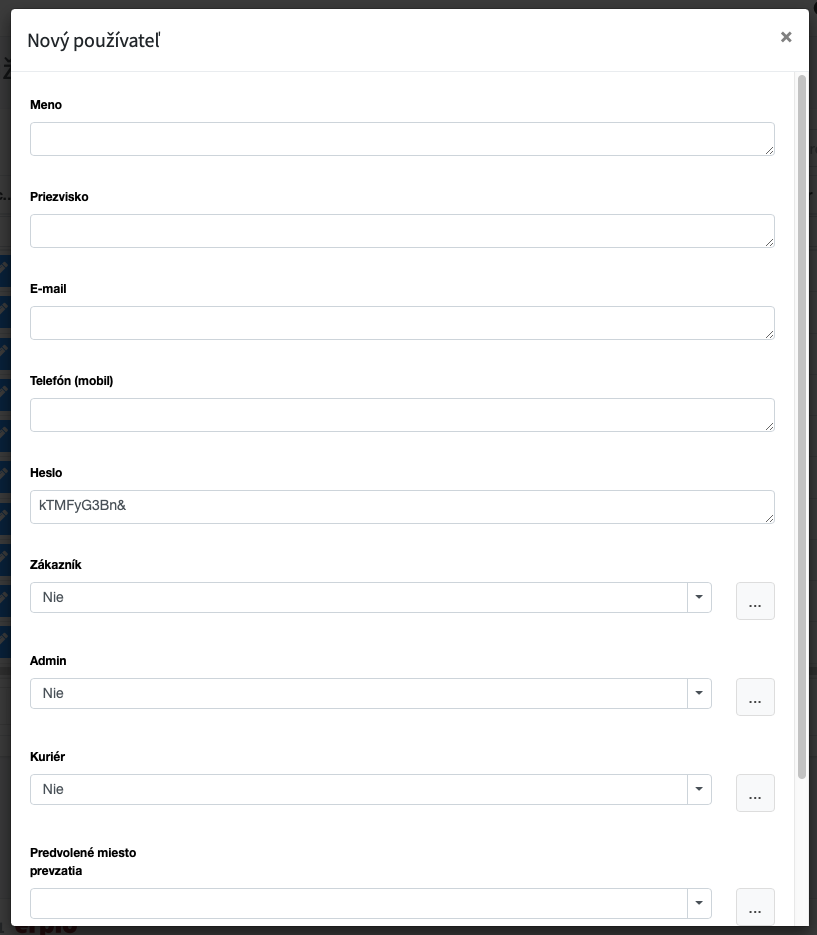 Je potrebné vyplniť všetky kontaktné údaje. Heslo sa vygeneruje automaticky. Pomocou poli Zákazník/Admin/Kuriér viete nastaviť ako bude aplikáciu daný používateľ používať. Nastavením Áno mu povolíte nastavenia pre danú rolu. Role je možné kombinovať, napr. používatel môže byť Admin aj Kuriér – vtedy nastavíte zákazník na Nie, Admin na Áno a Kuriér na Áno.