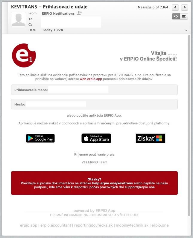 Po uložení sa na zadaný e-mail pošle pozvánka pre používanie aplikácie s linkami na webovú aj mobilnú aplikáciu a prihlasovacími údajmi. Zároveň v tejto mailovej pozvánke je aj odkaz na túto dokumentáciu.