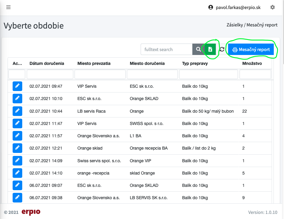 Po potvrdení sa zobrazí prehľad všetkých zásielok, ktoré mali dátum doručenia vo vybraný mesiac. Kliknutím na zelenu ikonu Excel sa vyexportuje prehlad tak, ako ho vidite pred sebou. Kliknutim na tlacidlo Mesacny report sa zobrazi nahľad reportu.